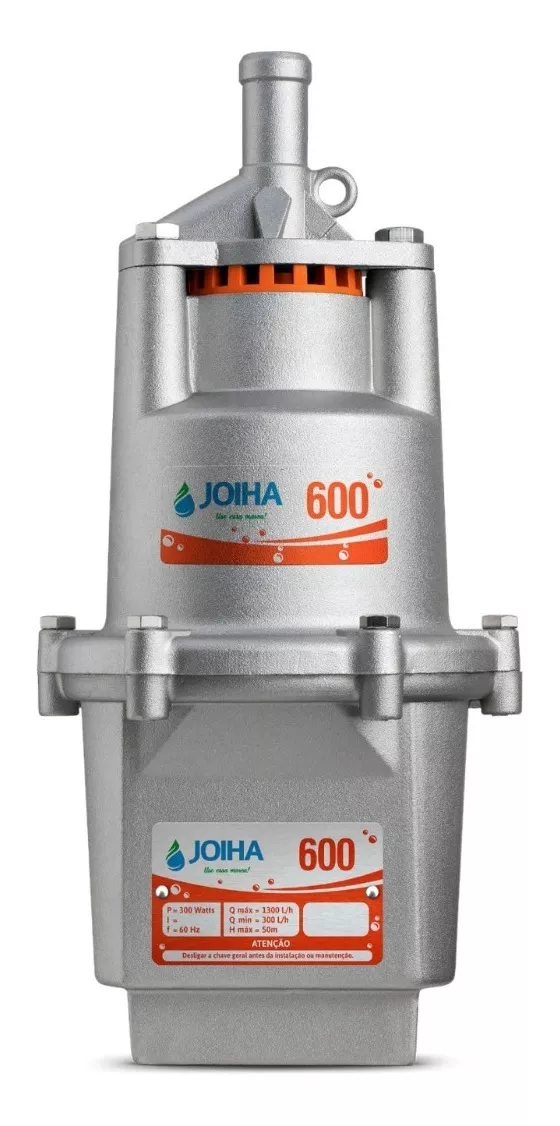 A Bomba Submersa Joiha 600 trabalha na altura manométrica de até 50 metros e tem vazão mínima de 300 L/h e podendo chegar à uma vazão máxima de 1300 L/h.